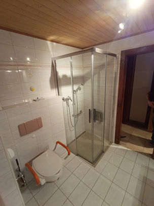 Dans le même chalet, nous avons transformé cette salle de bains de environ 4 m2 en un espace plus moderne. Nous avons remplacé l'ancienne baignoire par une baignoire avec porte et ont remplacé le wc au sol par un WC suspendu.